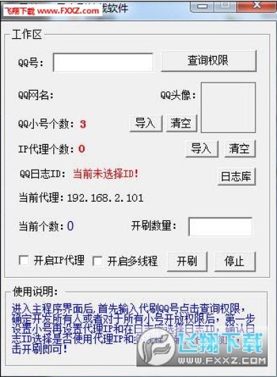 进入主程序界面后,首先输入代刷QQ号点击查询权限,确定开发所有人或者对于所有小号开放权限后,第一步设置小号再设置代理IP和在日志库选择日志ID,确认日志ID选择是否使用代理IP和多线程,输入待刷数量,点击开刷即可!