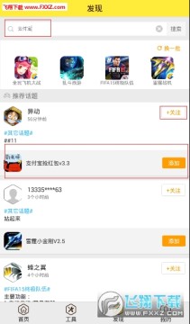 3、登陆后搜索支付宝抢红包,寻找作者蜂之翼,点击关注,关注后该作者发布的脚本与说明均会在游戏蜂窝的首页中显示。