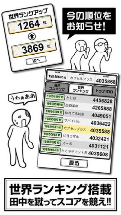 游戏的玩法很简单,游玩的界面站着一排撅着屁股背对着你的人,依次看过去,是田中桑的话,就点击“踢他”(ける!)按钮,不是田中的话就选择“不踢”(けらない)按钮。游戏有时间限制,考验的就是看谁能在最短时间内踢到最多的“田中”。此外,踢到“银屁股的田中”会得到比踢“普通田中”更多的分数,踢到“金屁股的田中”则得到比“踢银屁股的田中”更高的分数。
