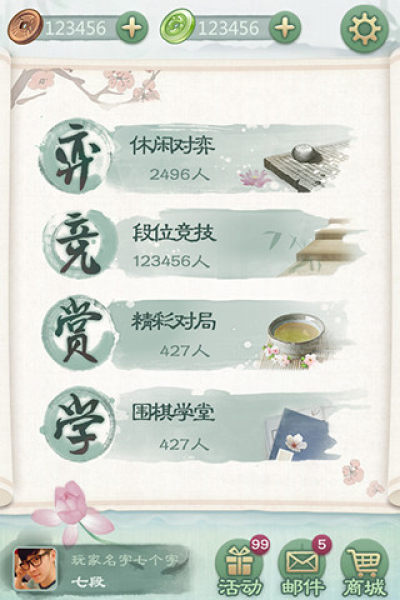 包含休闲对弈19路、13路、9路,段位升降竞技,人机对弈等功能