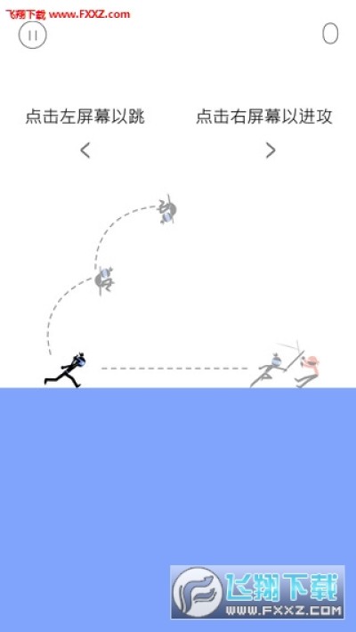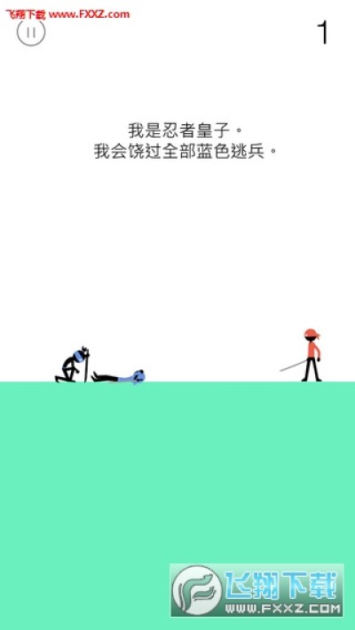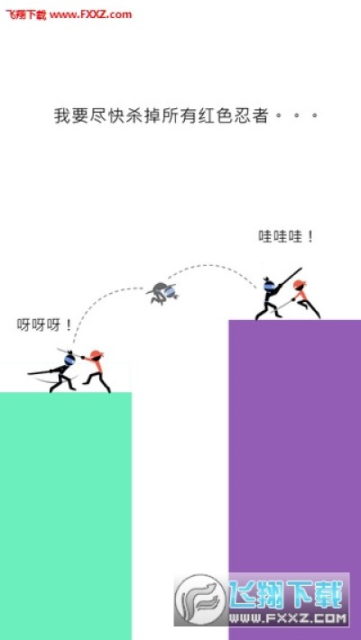 在这款游戏中,玩家在跑酷的路上会遇到蓝色和红色两种忍者,遇到蓝色忍者必须点击屏幕左边跳跃过去,如果碰撞或者踩到对方的头上,游戏就会失败。而红色忍者则是敌人,必须点击屏幕右方进行击杀,如果跑太快想跳过去,那就会死的很惨,因为对手会非常敏捷的进行追杀。