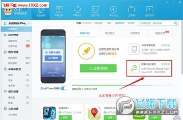拿起iPhone,打开和你一样机智勇敢的XY苹果助手并连接电脑,点击“修复闪退/授权”。