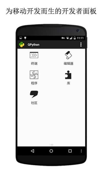QPython是一个在Android上运行Python脚本引擎,它整合了Python解释器、Console、编辑器和SL4A库。可以让你在Android设备上运行Python语言开发的程序。它就是Android上的Python!