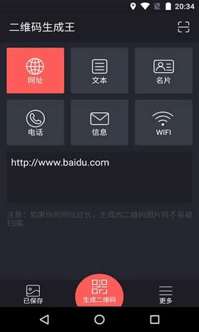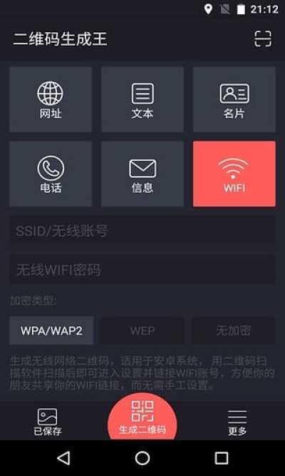 二维码生成王是一款免费、快捷、高效的二维码生成软件,可以把网址、文本、电子名片、wifi、电子邮件、短信、电话号码等信息生成对应的二维码图片。轻轻一扫,即可迅速获取信息,自动拨打电话,保存至手机通讯录。