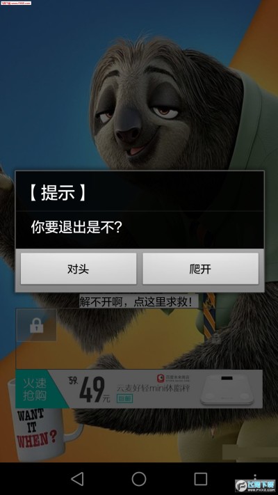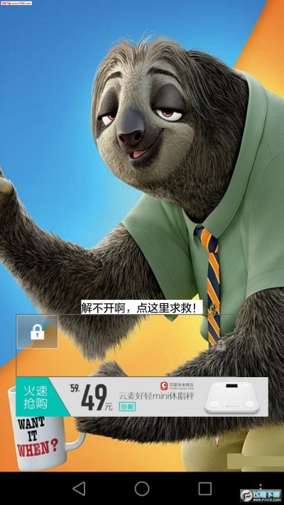 疯狂动物城树懒好慢的动作表情,锁屏拉锁解锁不能慢,十分有趣。同时支持两种方式解锁,可以通过拉锁解锁,也可以点击“点这求救解开锁”。