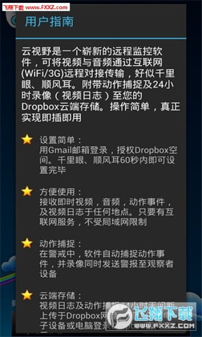 家中有闲着的安卓手机或平板电脑吗?有了云视野,您可以量身打造一个专属于您的安全监控摄像系统.在闲置设备和随身手机上都下载云视野,您只需要有一个Gmail账户即可登录,配对,并从随时手机察看家中手机拍摄的画面及声音.您只需申请免费一个Dropbox账户,即可获得2G云端储存空间,开启24小时无间断录像.云视野采用点对点连接技术,无需设置路由器,可使用于任何地点通过WiFi, 3G. 4G上网.可靠的动作捕捉,让你随时随地保护你的家人财产安全.个性化设置让你打造最适合你的使用要求,使用条件的监控系统.