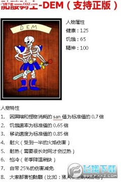 饥荒海难骷髅骑士MOD,玩家安装后可以获得一个新的角色——身穿铠甲的骷髅骑士。这个角色三维是125.65.100,不算太出众,不过自带的人物特性非常牛逼,自带25%的伤害减免,喜欢的玩家不要错过了。