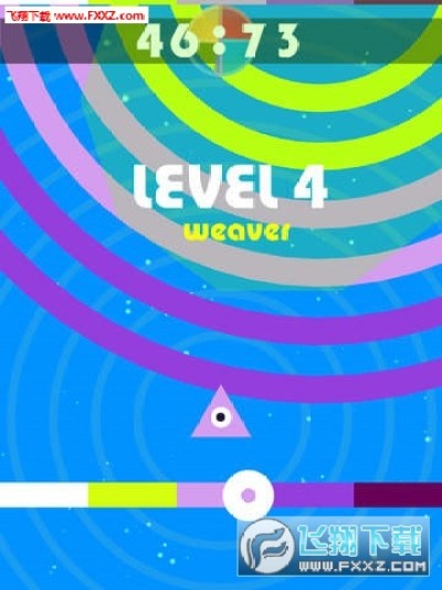 在三角的下方有一条被分为两种颜色的彩带,滑动彩带上的圆圈,小三角就会随着圆圈到达的地带改变颜色,屏幕上方不断的有不同颜色的波圈扩散下来。