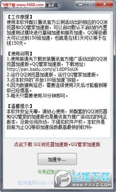 使用本软件配以腾讯官方公测活动出的相应的QQ浏览器和QQ管家加速版,可以启动默认不启动的内置加速测试模块进行基础加速和服务加速,QQ等级最大可以达到150倍加速,也就是在线1天可以等于在线150天。