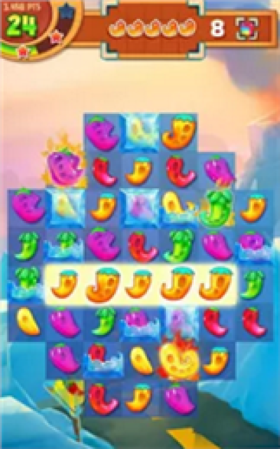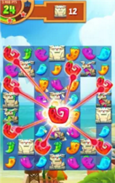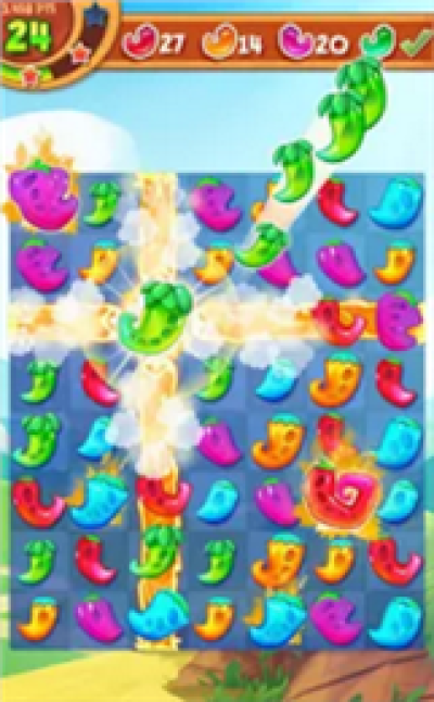 这款游戏看起来和一般的消除游戏没多大区别,但其实难度会更高一层,因为一般来说游戏的通关任务都是要收集指定数量的超大辣椒,而这些超大辣椒需要通过至少三次的匹配消除才会爆炸,如果只是按部就班地小范围消除,很可能就会耗光步数而无法通关了。