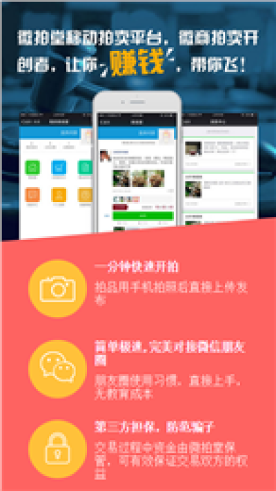 该应用完全遵循朋友圈习惯设计的页面,确保每一位用户都能直接使用无任何障碍;用户发布拍卖物品,选图加描述、定价格,轻松搞定。全面接入微信,可以实时提醒拍主和用户竞拍情况。