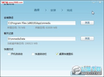 选择软件安装目录,聊天记录保存目录,选择是否创建快速启动栏和桌面快捷方式,是否设置开机自启动