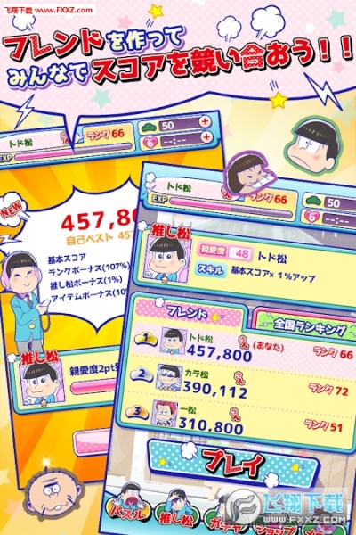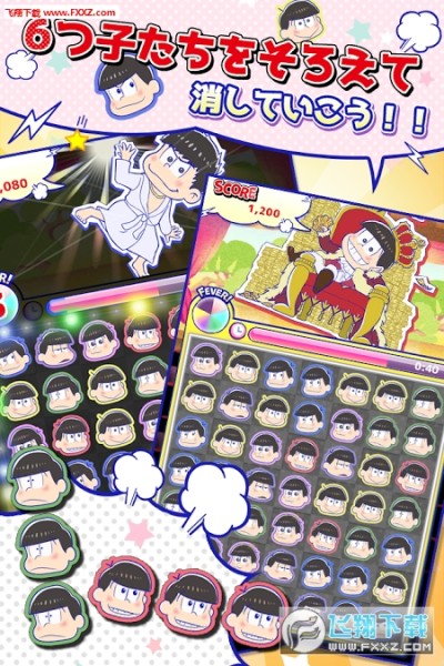 《三消阿松》以人气动画《阿松》中的松野家6子为主角的一款消除益智游戏。游戏的要点是要好好的认识,区分6子!另外,提高主推的阿松的亲密度后,主推的阿松会能力增加!还搭载有排名机能,可以和全日本的迷妹一起竞争排名。