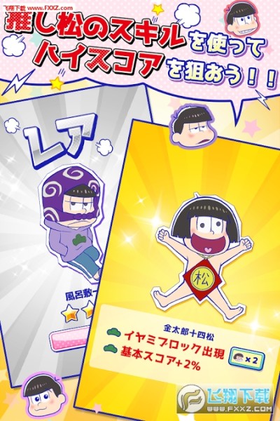 《三消阿松》以人气动画《阿松》中的松野家6子为主角的一款消除益智游戏。游戏的要点是要好好的认识,区分6子!另外,提高主推的阿松的亲密度后,主推的阿松会能力增加!还搭载有排名机能,可以和全日本的迷妹一起竞争排名。
