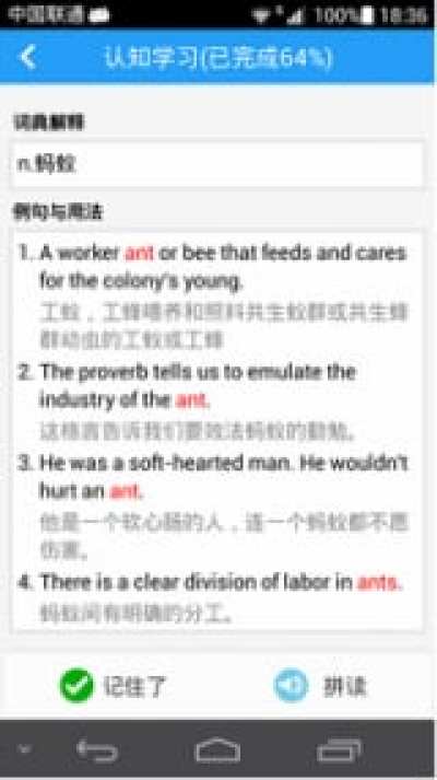 蚂蚁单词王,不必联网、随时随地背单词,提供从小学到出国考试的各类教材,单词配有真人发音、图片、词缀、例句等多种学习方式和测试方式,有单词拼音功能。