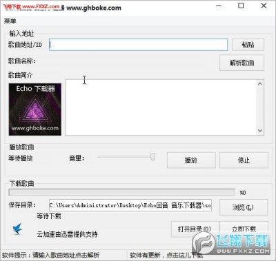 Echo回声音乐解析下载器是一款针对Echo回声网的音乐解析和下载工具(音乐播放基于bass下载,下载基于迅雷云开发平台);只需输入音乐地址,即可帮助用户快速解析歌曲,支持播放和一键下载功能,简单实用,需要的朋友快来下载吧!