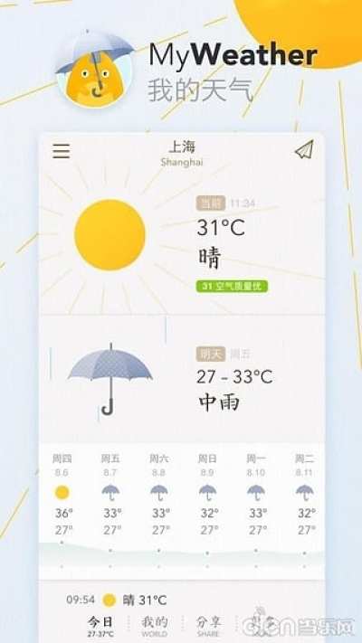 我的天气MyWeather是一款充满个性化元素的手机端天气服务类软件。里面有各种手工打造的软件皮肤界面可供用户选择。