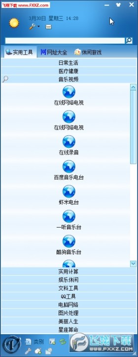 万能查询工具的页面类似于QQ,可是它却是一个实实在在的程序管理软件,桌面上所有的程序、文件、文件夹甚至是网页都可以拖拽到它的控制面板内,用户可以分门别类进行管理,更有效率的启动程序。它拥有与QQ一样精致的界面,并且可以像QQ一样自动隐藏在桌面顶部。