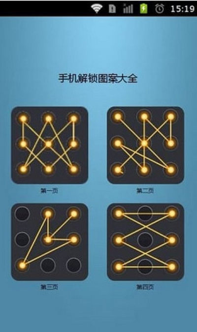 小编的手机解锁非常简单就是画个圈,有难度的就是怕自己忘记了。。有什么比较好记且不会让别人轻易解锁的图案么?手机解锁图案大全拥有最全的解锁图案,让你得手机更加安全~