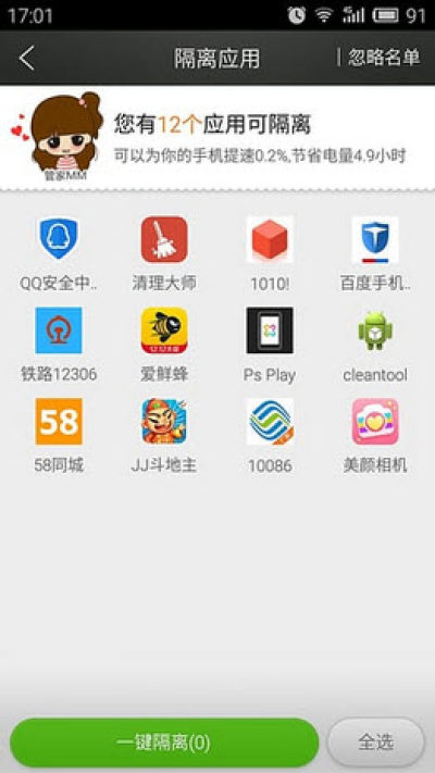 内存大师(应用管家)对手机应用进行隔离看护,提高电池使用时间。隔离后,相比隔离前电池使用时间含有明显变化。通常情况下用户退出正在使用的应用程序后,应用仍在后台偷偷运行,为了提升电池的有效使用,内存大师(应用管家)将应用隔离后进行监控和软禁,犹如在手机中被冰冻不能进行电量请求和后台运行,达到为用户节省电量、省流量、拦截骚扰的目的。