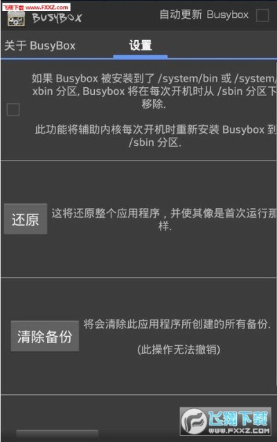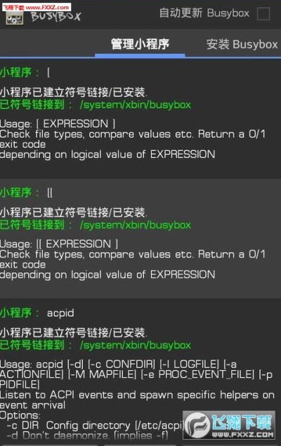 BusyBox 是款整合了多种常用linux命令和工具的应用程序。BusyBox 包含了某些简单的工具,例如 cat 和 echo,还包含了其他更强大、更复杂的工具,例如 grep、find、mount 以及 telnet。有些人将 BusyBox 称为 Linux 工具里的瑞士军刀。简单的说BusyBox就好像是个大工具箱,集成压缩了 Linux 的许多工具和命令。也包含了 Android 系统的自带的 shell(需要ROOT访问权限)