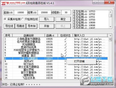 点击开始即可开始采集,可导出在线的和离线的以及未知的,右键点击列表中的某个店铺弹出菜单,点击打开店铺,即进入当前选中的店铺,双击选中的店铺名将会弹出聊天窗口(前提是您登陆了京东咚咚)