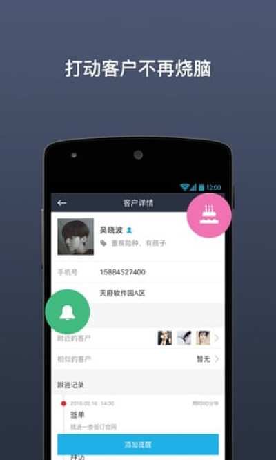 【客户管理】客户信息随看随记,重要计划及时提醒,随时随地加深对客户的了解,抓住客户需求,签单就成功了一半,更有附近客户推荐,提升拜访效率;