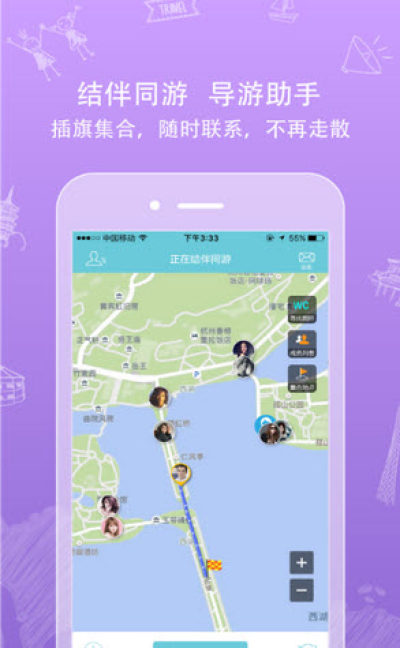 导游助手,临时组队不用担心隐私泄露,导游/队长可设定统一的集合地点,同时每个用户端都会生成前往集合点的路径规划。另外队员还可以随时看到彼此的位置,并能及时电话联系,不用担心走失。
