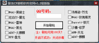 暴龙CF刷枪软件,主要可免费刷M4A1-黑骑士、尼泊尔-屠龙、M4A1-雷神、M4A1-黑龙等稀有枪支,有需要的朋友可以下载使用。