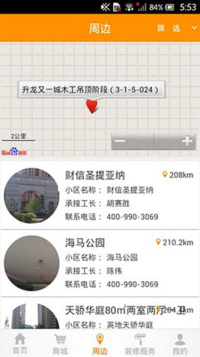 3.周边:系统自动定位搜索您身边的工长、设计师、在建工地、工人、材料商,可以查看其详细信息、离我的距离,地图位置定位,电话拨打。