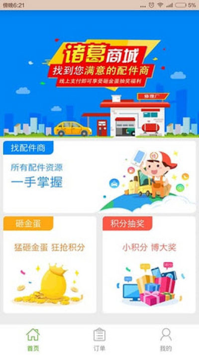 修理厂用户在诸葛商城手机端,可以注册账号,查找配件商信息,拨打配件商电话,接收和查看所有订单,支付订单,参与砸金蛋活动,参与积分抽奖活动。