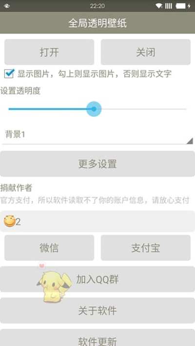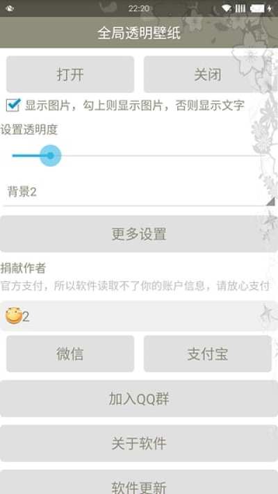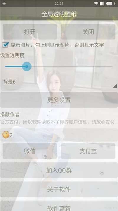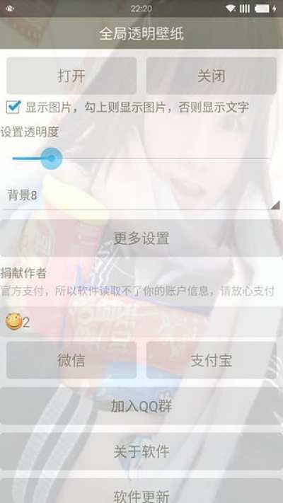 全局透明壁纸app,一款非常好用的壁纸应用,主要可覆盖一张图片或者一些文字你的屏幕之上,这样你就可以看你想看见的东西了。