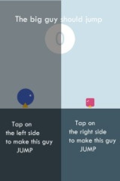 游戏的玩法是点击屏幕左右边使大个子从小个子头上跳过去,前面几次应该没什么问题,但到了后面很可能受颜色和形状的欺骗点错。JUMP OUT! 中的大家伙需要跳起来让他们都安全!这很简单!?