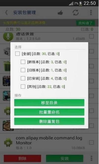 3.可批量删除、安装APK安装包,智能筛选重复包,旧版本包