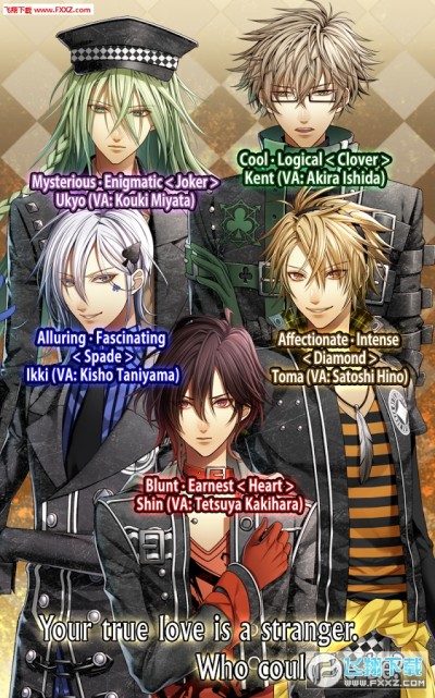 游戏一开始玩家可选择不同的世界(路线)进行游戏,在不同的世界中女主角可以与不同的男主角发生故事,其中包括冷淡却专一的年下少年SHIN(红心)、拥有使女性迷恋上自己的神秘体质的IKKI(黑桃)、凡事用理性角度思考的死板技术宅KENT(梅花)、温柔病娇兄长系TOMA(方块)以及一直默默守护着女主角的神秘人UKYO(Joker)。失忆了的女主角到底曾经跟他们有过什么样的过去,接下来又会发生什么样的故事。