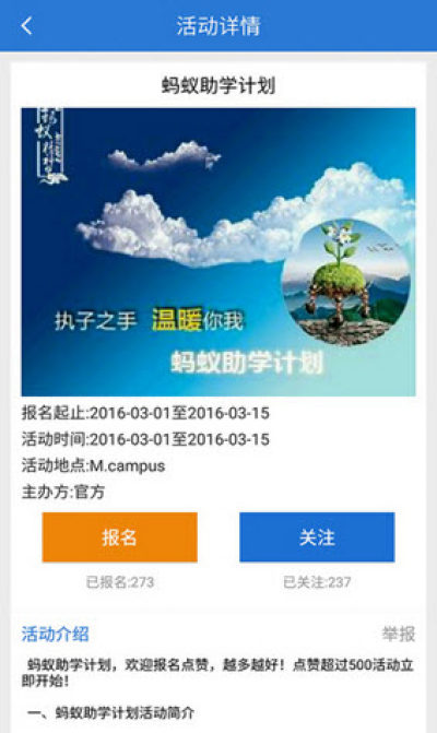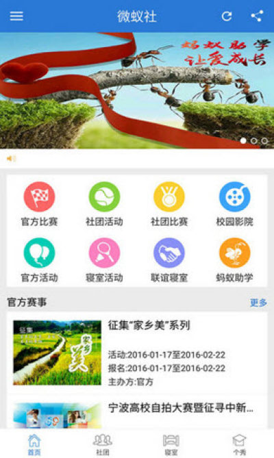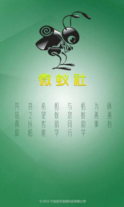 微蚁社是蚂蚁助学计划的管理组织,是由各高校公益社团自发组织的大型公益组织。借取蚂蚁爱心、同情心、团队合作与忠诚的精神,由大学生志愿者亲自寻找需要资助的贫困学生(蚂蚁宝贝),征集50个大学生(蚂蚁)对其资助,每人每月2元,每月资助蚂蚁宝贝100元,一期为一年。以上共同形成一个蚁窝。微蚁社APP是众多蚁窝组织、建立、活动的官方平台。