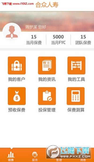 合众容e保app可以让基层保险员工登录用户首页相关数据信息样式修改,显示为当月保费、当月FYC和团队保费。合众容e保ap四大功能模块:销售、服务、管理和消息。