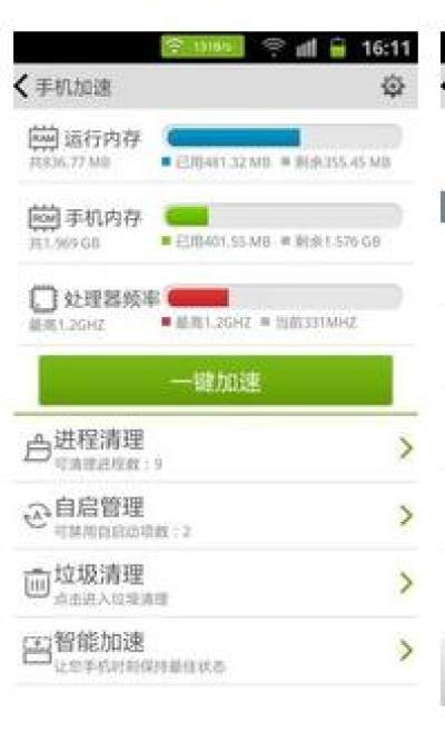 2. 手机加速:海卓首创贴心智能加速,彻底清理进程不反弹,定时/开屏/高于某个值自动清理垃圾,让您的手机始终快步如飞!