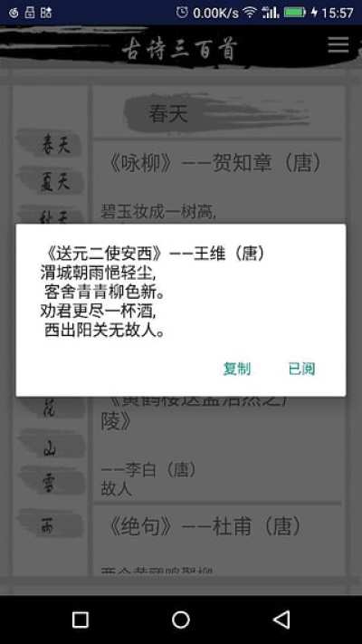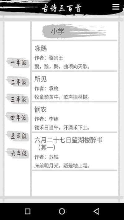 跟我学古诗收录了各个阶段学生学习的古诗课文,并附有详细的解析注释,还收录了唐诗300首,课外古诗学习等,专注于古诗文服务,致力于让广大中小学生更好的学习进步,让爱好古诗文的学者能够更便捷的获取古诗文资料。