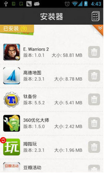 2、 普通APK安装包扫描和管理功能,对SD卡和手机内存的APK安装包轻松实现安装和卸载功能, 让您一目了然知道手机内存空间的使用情况;