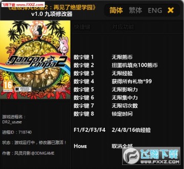 超级弹丸论破2:再见了绝望学园修改器+9,由3DM风灵月影制作提供,给玩家准备了无限熊币、无限经验等九项功能。虽然超级弹丸论破2:再见了绝望学园是一款操作性不强的文字冒险游戏,但是想要顺利通关依旧难度不小,使用修改器可以助你轻松通关。