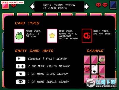 精神卡片汉化版是一款卡牌对战游戏,玩法和《扫雷》非常类似。游戏中的牌桌上将会出现32张卡牌,其中含有5张水果卡、2张星星卡和3张骷髅卡。玩家在游戏中要做的就是比对手更快找到3张水果卡赢得胜利,不过如果翻开的是骷髅卡,玩家就会输掉这局游戏。游戏中还会出现空白卡,他将会指引玩家附近的牌的内容。