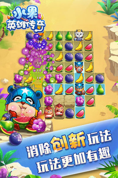 3、结合了市面上主流的三消游戏玩法,并在此基础上创新性的加入了配对相同水果召唤英雄机制;