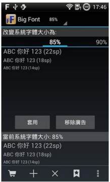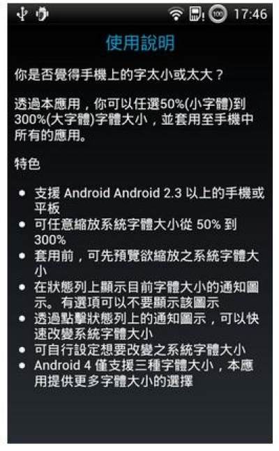 - Android 4 仅支援三种字体大小,本应用提供更多字体大小的选择