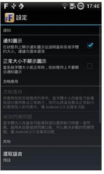 - 在状态列上显示目前字体大小的通知图示。有选项可以不要显示该图示