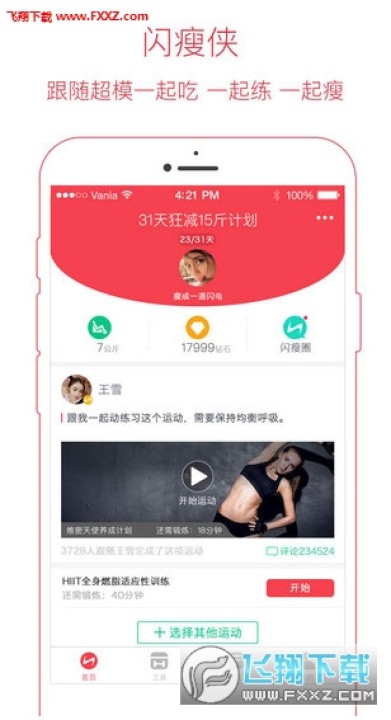 包含详细饮食和运动计划的瘦身卡片:闪瘦为用户定制适合的专属瘦身卡片,7天3斤闪瘦计划、3天1斤闪瘦计划、21天5斤闪瘦计划、4周6斤闪瘦外卖计划、过节7天吃肉不长胖计划等,跟着卡片吃和练就可以100%成功瘦身。