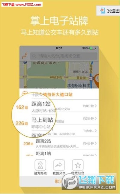 1.实时公交查询。提供超过10000多辆成都公交车的实时查询功能,掌中公交电子站牌,更方便更轻松。同时,一键分享微博、微信等社交平台,让更多的同城朋友了解公交动态。