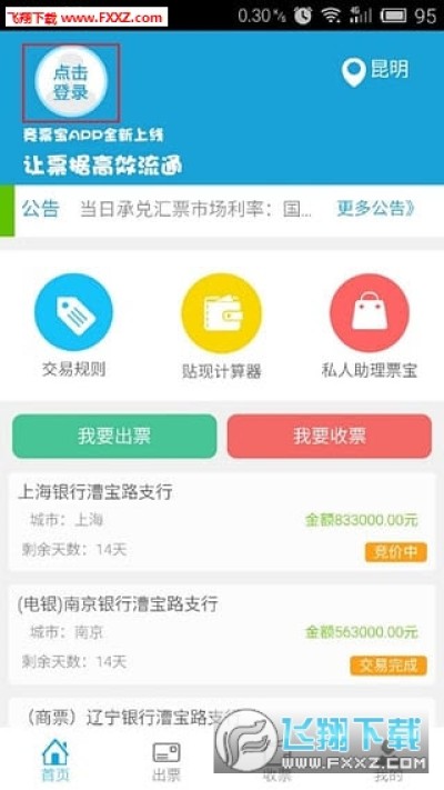2.审核通过后---点击出票---点击右上角“添加汇票”进行汇票信息的上传---通过滑动手机屏幕选择交易省市---输入兑票行、汇票金额、汇票到期日---选择票据类型、有无保兑保函和远期回购协议---上传汇票正面及背面图片信息---提交信息---等待审核(可在“我的汇票”中查看审核状态)---审核通过后可选择“参加竞价”进入实时竞价系统,或选择“参加报价”进入报价推送系统