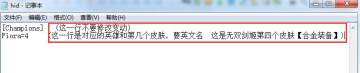Fiora=4 '这一行是对应的英雄和第几个皮肤,要英文名 这是无双剑姬第四个皮肤【合金装备】