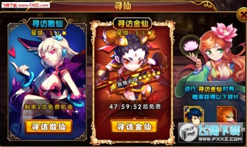 b)寻访金仙:有几率得到1-3星神仙、神仙碎片、各等级经验药水、各等级修炼材料。每次抽取花费298元宝;每48小时可免费抽取一次;